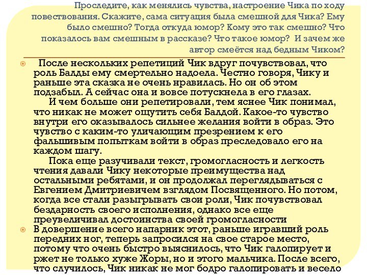 было смешно? Тогда откуда юмор? Кому это так смешно? Что показалось вам смешным в рассказе? Что такое юмор? И зачем же автор смеётся над бедным Чиком?