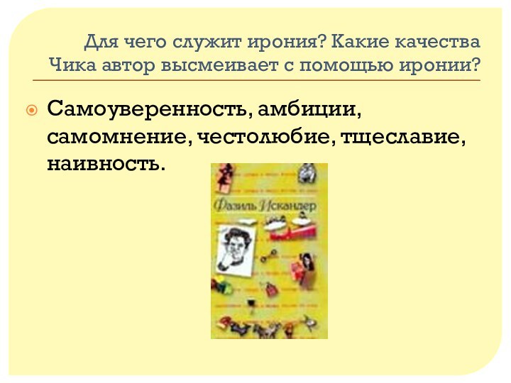 Слайд 7 Для чего служит ирония? Какие качества Чика автор