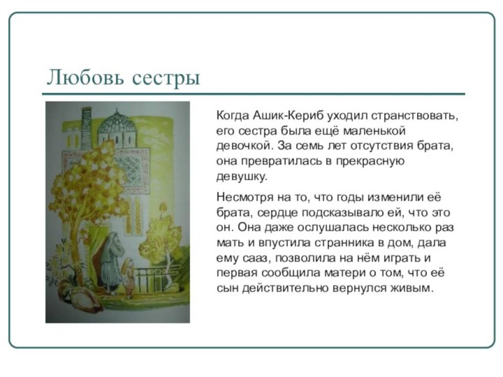 Когда Ашик-Кериб уходил странствовать, его сестра была