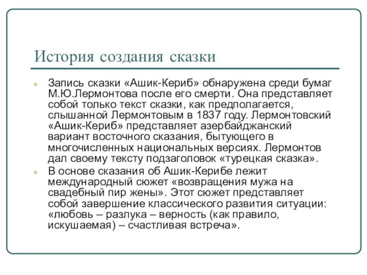 сказки, как предполагается, слышанной Лермонтовым в 1837 году. Лермонтовский «Ашик-Кериб» представляет азербайджанский вариант восточного сказания, бытующего в многочисленных национальных версиях. Лермонтов дал своему тексту подзаголовок «турецкая сказка».
