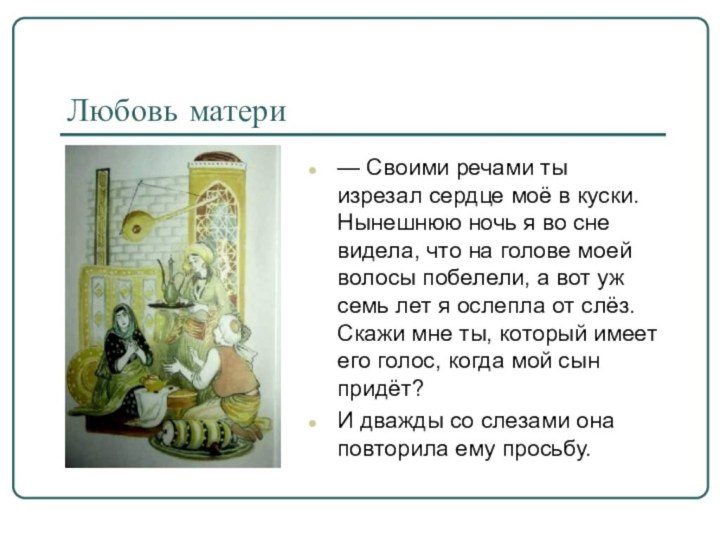 на голове моей волосы побелели, а вот уж семь лет я ослепла от слёз. Скажи мне ты, который имеет его голос, когда мой сын придёт?