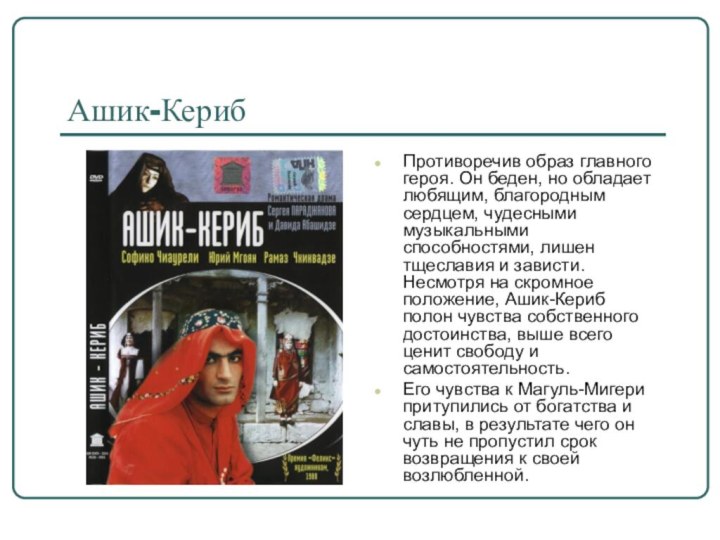 зависти. Несмотря на скромное положение, Ашик-Кериб полон чувства собственного достоинства, выше всего ценит свободу и самостоятельность.