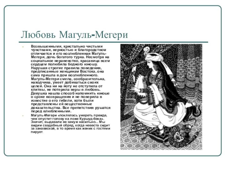 на социальное неравенство, красавица всем сердцем полюбила бедного юношу. Нарушая строгие правила поведения, предписанные женщинам Востока, она сама пришла в дом возлюбленного. Магуль-Мегери смела, сообразительна, находчива, умеет добиваться своих целей. Она ни на йоту не отступила от клятвы, не потеряла веры в любовь. Девушка нашла способ напомнить юноше о сроке возвращения и не поверила в известие о его гибели, хотя были представлены ей вещественные доказательства. Все препятствия рушатся перед влюбленными.