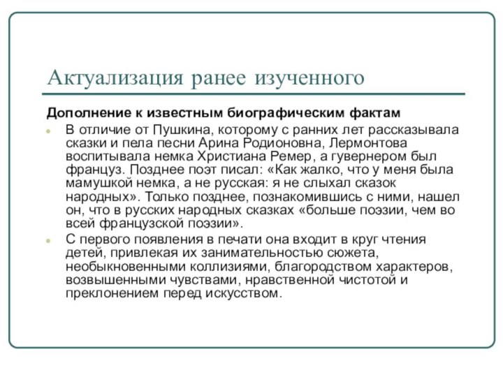 пела песни Арина Родионовна, Лермонтова воспитывала немка Христиана Ремер, а гувернером был француз. Позднее поэт писал: «Как жалко, что у меня была мамушкой немка, а не русская: я не слыхал сказок народных». Только позднее, познакомившись с ними, нашел он, что в русских народных сказках «больше поэзии, чем во всей французской поэзии».