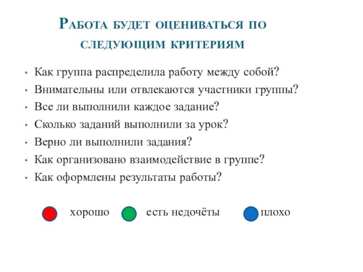 собой? Внимательны или отвлекаются участники группы? Все ли выполнили каждое задание? Сколько заданий выполнили за урок? Верно ли выполнили задания? Как организовано взаимодействие в группе? Как оформлены результаты работы?