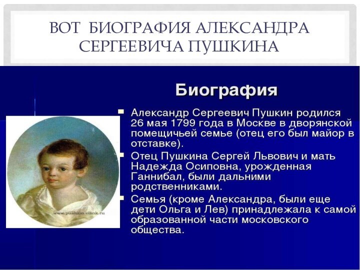 Слайд 2 Вот биография Александра Сергеевича Пушкина