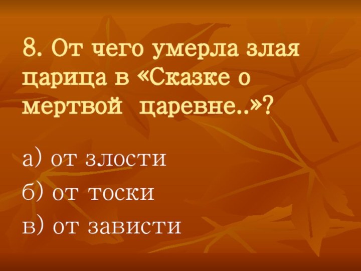 Слайд 35 8. От чего умерла злая царица в «Сказке