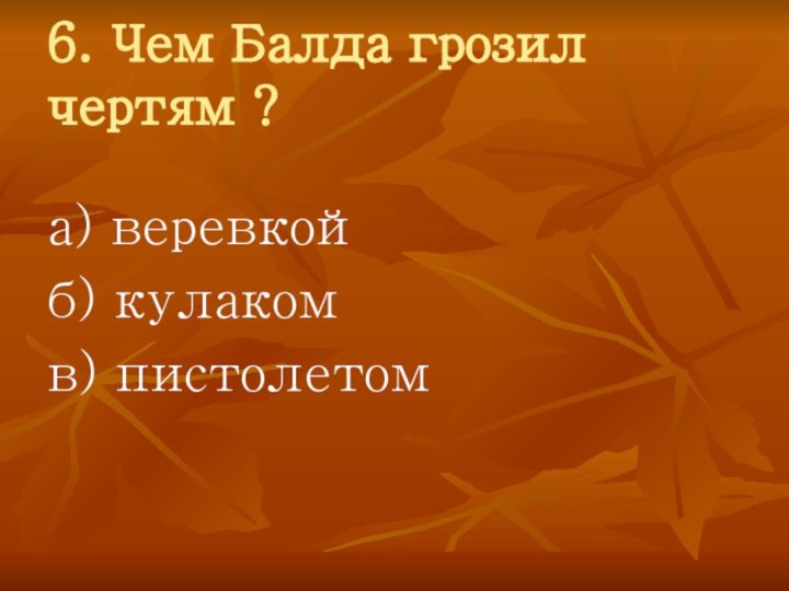 6. Чем Балда грозил чертям ?а) веревкойб) кулакомв) пистолетом
