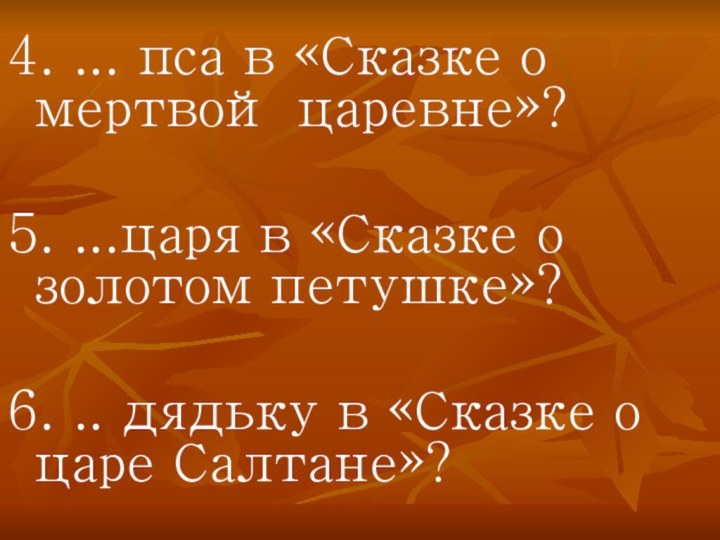4. ... пса в «Сказке о мертвой царевне»?5. ...царя в «Сказке