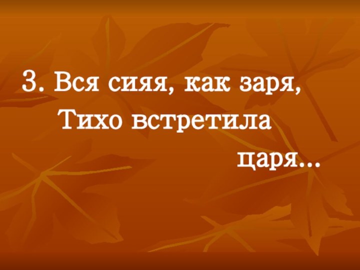 3. Вся сияя, как заря, Тихо встретила       царя...