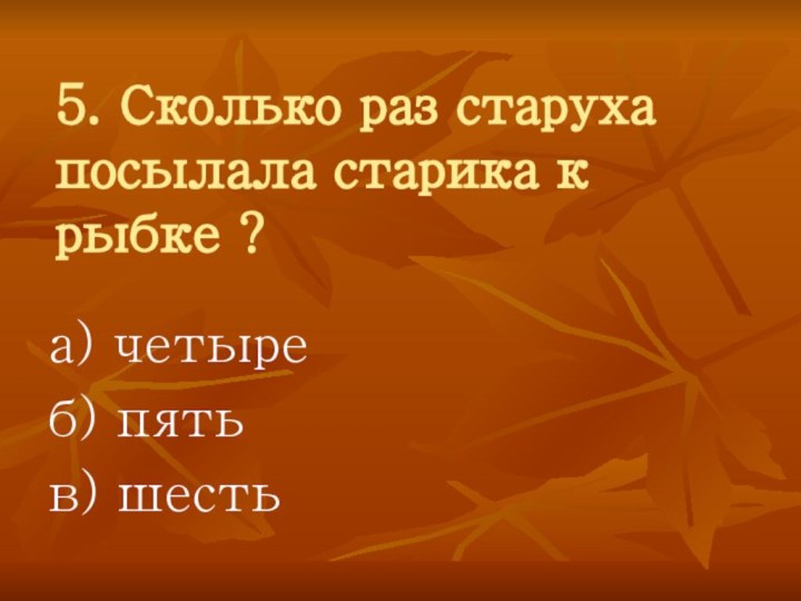 5. Сколько раз старуха посылала старика к рыбке ?а) четыреб) пятьв) шесть