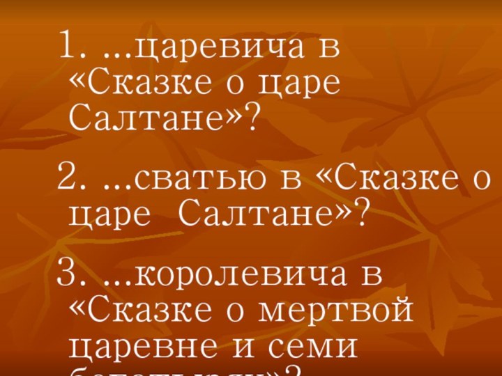 1. ...царевича в «Сказке о царе Салтане»? 2. ...сватью в «Сказке