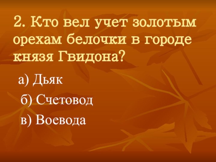 2. Кто вел учет золотым орехам белочки в городе князя Гвидона?