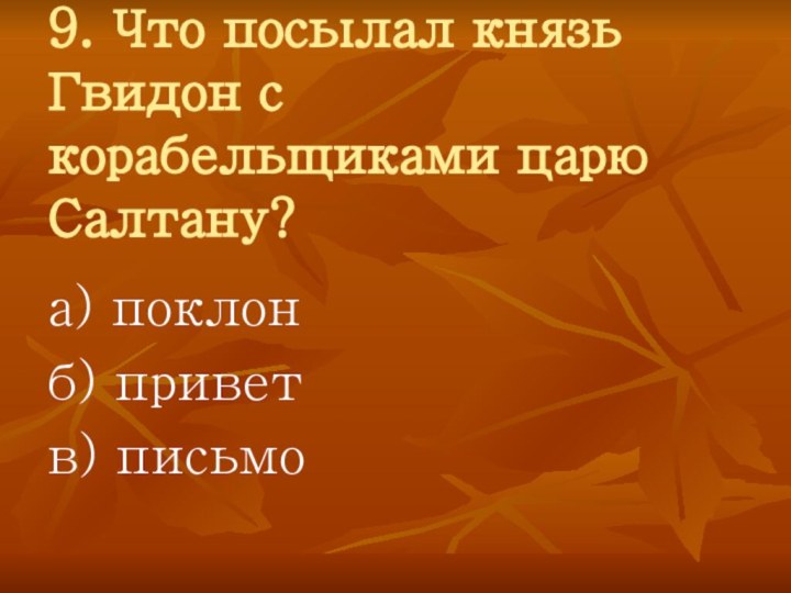 9. Что посылал князь Гвидон с корабельщиками царю Салтану?а) поклонб) приветв) письмо