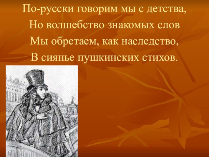 По-русски говорим мы с детства,Но волшебство знакомых словМы обретаем, как наследство,В сиянье пушкинских стихов.