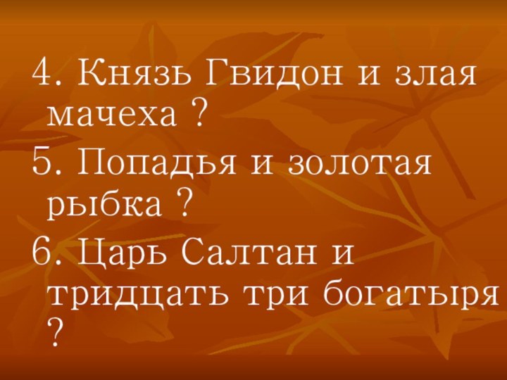4. Князь Гвидон и злая мачеха ?5. Попадья и золотая рыбка
