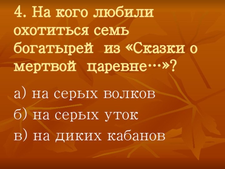 4. На кого любили охотиться семь богатырей из «Сказки о мертвой