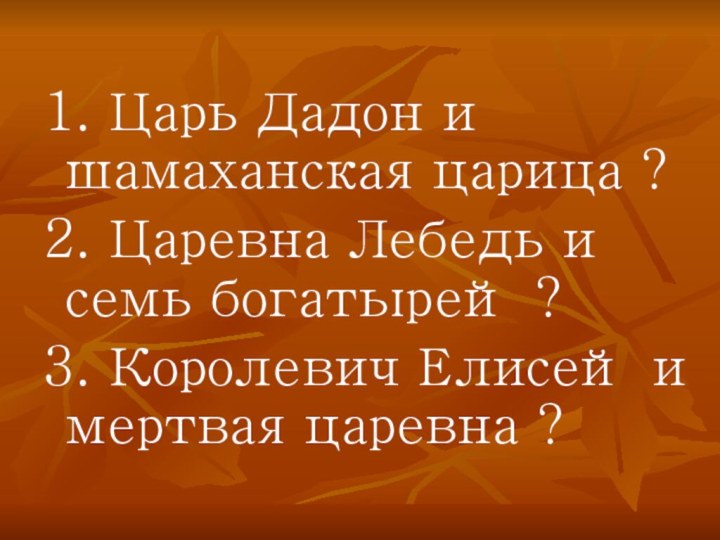 1. Царь Дадон и шамаханская царица ?2. Царевна Лебедь и семь