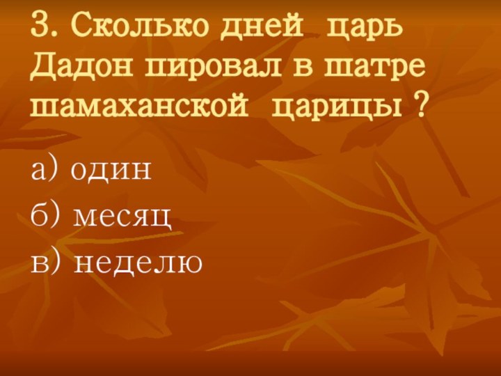3. Сколько дней царь Дадон пировал в шатре шамаханской царицы ?а) одинб) месяцв) неделю