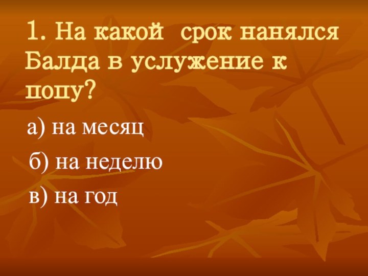 Слайд 28 1. На какой срок нанялся Балда в услужение
