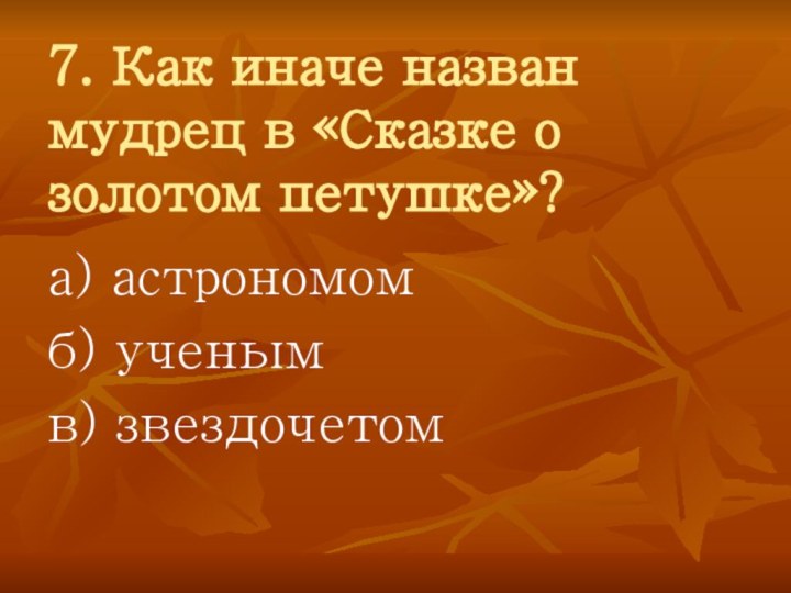 7. Как иначе назван мудрец в «Сказке о золотом петушке»?а) астрономомб) ученымв) звездочетом