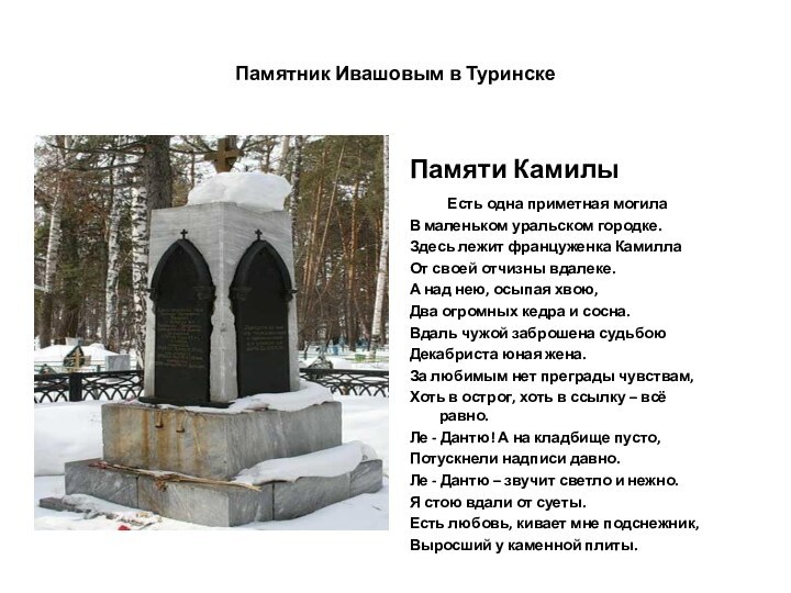 Памятник Ивашовым в ТуринскеПамяти Камилы   Есть одна приметная могила
