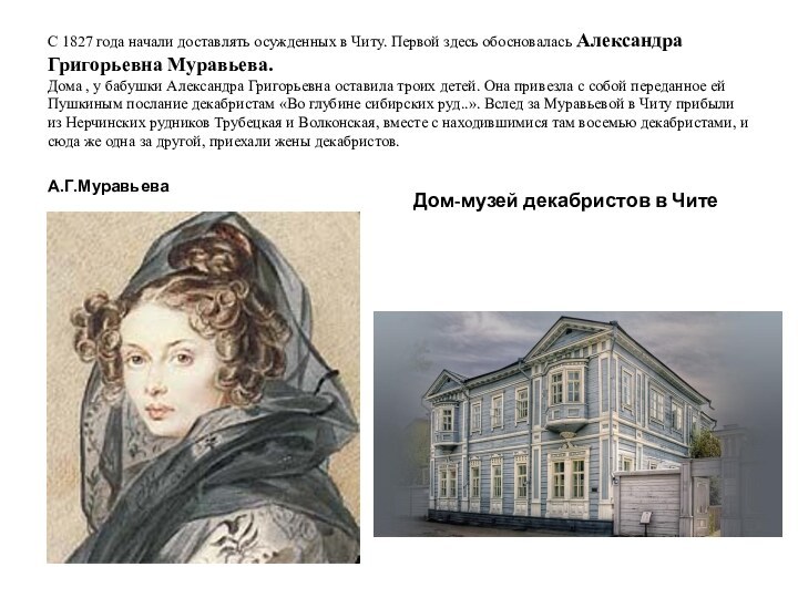 Александра Григорьевна оставила троих детей. Она привезла с собой переданное ей Пушкиным послание декабристам «Во глубине сибирских руд..». Вслед за Муравьевой в Читу прибыли из Нерчинских рудников Трубецкая и Волконская, вместе с находившимися там восемью декабристами, и сюда же одна за другой, приехали жены декабристов.