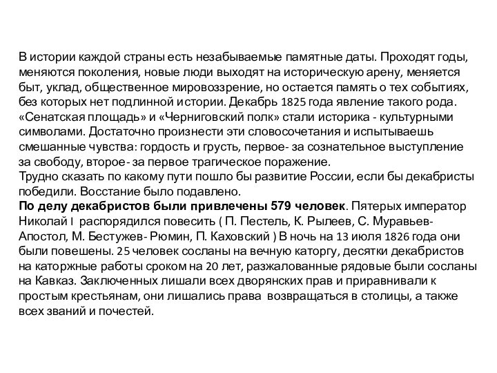 «Сенатская площадь» и «Черниговский полк» стали историка - культурными символами. Достаточно произнести эти словосочетания и испытываешь смешанные чувства: гордость и грусть, первое- за сознательное выступление за свободу, второе- за первое трагическое поражение.