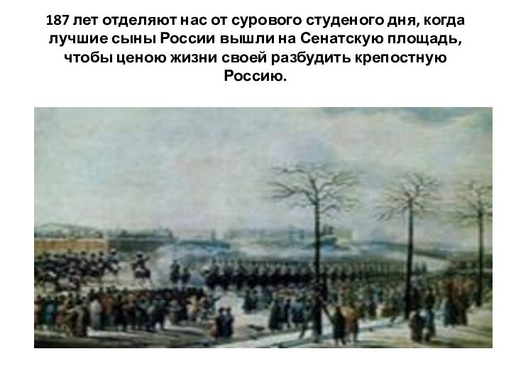 187 лет отделяют нас от сурового студеного дня, когда лучшие сыны России вышли на Сенатскую площадь, чтобы ценою жизни своей разбудить крепостную Россию.