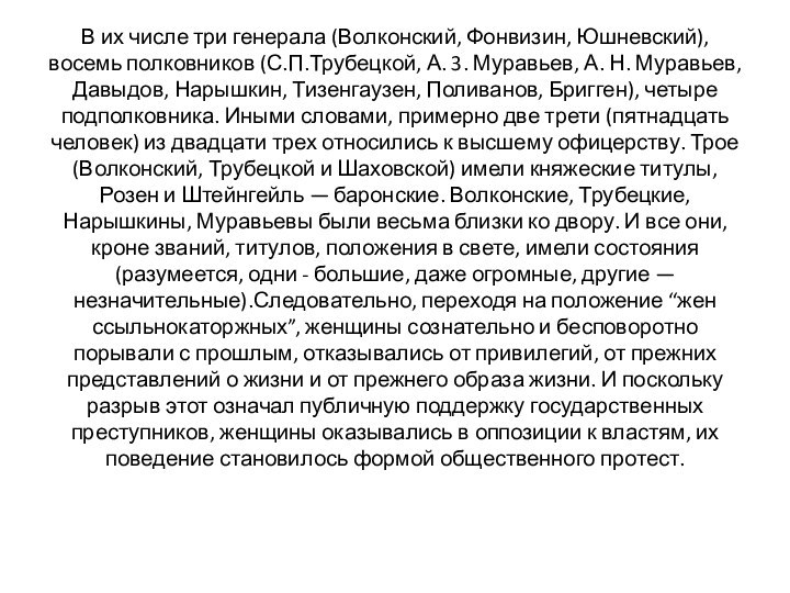 Давыдов, Нарышкин, Тизенгаузен, Поливанов, Бригген), четыре подполковника. Иными словами, примерно две трети (пятнадцать человек) из двадцати трех относились к высшему офицерству. Трое (Волконский, Трубецкой и Шаховской) имели княжеские титулы, Розен и Штейнгейль — баронские. Волконские, Трубецкие, Нарышкины, Муравьевы были весьма близки ко двору. И все они, кроне званий, титулов, положения в свете, имели состояния (разумеется, одни - большие, даже огромные, другие — незначительные).Следовательно, переходя на положение “жен ссыльнокаторжных”, женщины сознательно и бесповоротно порывали с прошлым, отказывались от привилегий, от прежних представлений о жизни и от прежнего образа жизни. И поскольку разрыв этот означал публичную поддержку государственных преступников, женщины оказывались в оппозиции к властям, их поведение становилось формой общественного протест.