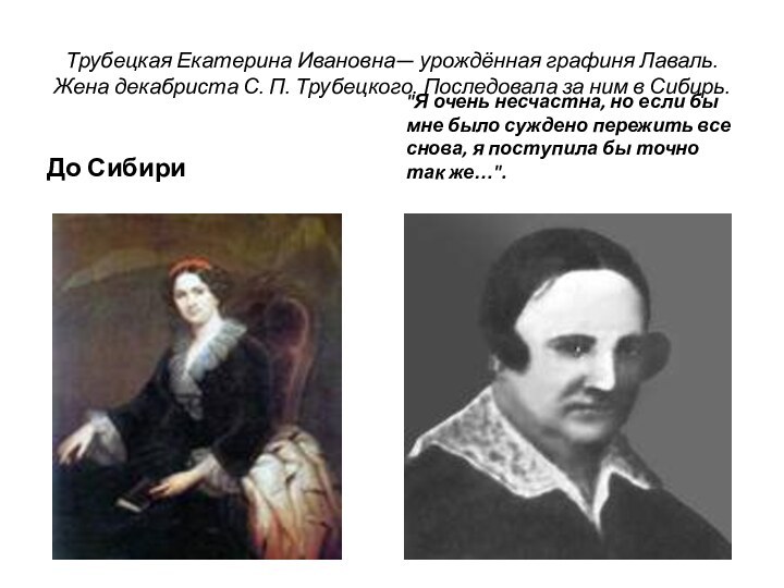 Трубецкая Екатерина Ивановна— урождённая графиня Лаваль. Жена декабриста С. П. Трубецкого. Последовала за ним в Сибирь.