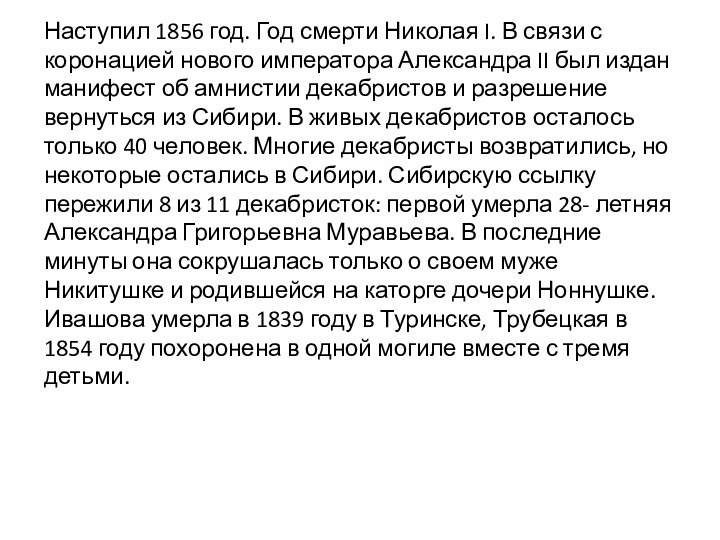 манифест об амнистии декабристов и разрешение вернуться из Сибири. В живых декабристов осталось только 40 человек. Многие декабристы возвратились, но некоторые остались в Сибири. Сибирскую ссылку пережили 8 из 11 декабристок: первой умерла 28- летняя Александра Григорьевна Муравьева. В последние минуты она сокрушалась только о своем муже Никитушке и родившейся на каторге дочери Ноннушке. Ивашова умерла в 1839 году в Туринске, Трубецкая в 1854 году похоронена в одной могиле вместе с тремя детьми.