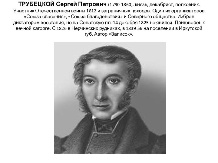 Слайд 8 ТРУБЕЦКОЙ Сергей Петрович (1790-1860), князь, декабрист, полковник. Участник
