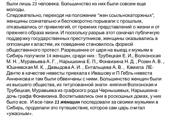 Следовательно, переходя на положение “жен ссыльнокаторжных”, женщины сознательно и бесповоротно порывали с прошлым, отказывались от привилегий, от прежних представлений о жизни и от прежнего образа жизни. И поскольку разрыв этот означал публичную поддержку государственных преступников, женщины оказывались в оппозиции к властям, их поведение становилось формой общественного протест. Разрешение от царя на выезд к мужьям в Сибирь получили 14 женщин, среди них : Трубецкая Е. И., Волконская М. Н. , Муравьева А. Г. , Нарышкина Е. П., Фонвизина Н. Д. , Розен А. В. , Юшневская М. К. , Давыдова А. И. , Ентальцева А. В. , Камила ЛЕ- Дантю в качестве невесты приехала к Ивашову и П Гебль невеста Анненкова и там были обвенчаны с ними. Большинство женщин были из высшего общества, из титулованной знати- княгиня Волконская и Трубецкая, Муравьева из графского рода Чернышевых, Нарышкина- дочь графа Фонвизина. Воспитывались они в роскошных домах, у них было все. И все-таки 11 женщин последовали за своими мужьями в Сибирь, проделали это путешествие, которое сам царь считал «ужасным».