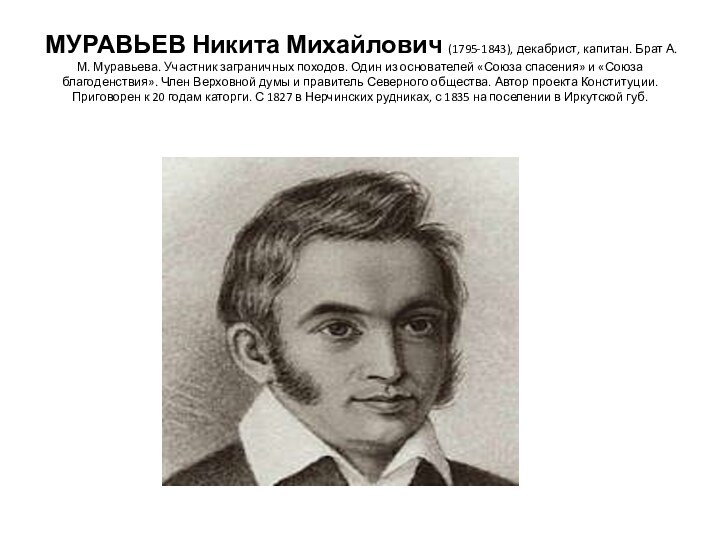 Слайд 9 МУРАВЬЕВ Никита Михайлович (1795-1843), декабрист, капитан. Брат А.