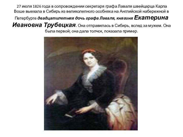 великолепного особняка на Английской набережной в Петербурге двадцатилетняя дочь графа Лаваля, княгиня Екатерина Ивановна Трубецкая. Она отправилась в Сибирь, вслед за мужем. Она была первой; она дала толчок, показала пример.
