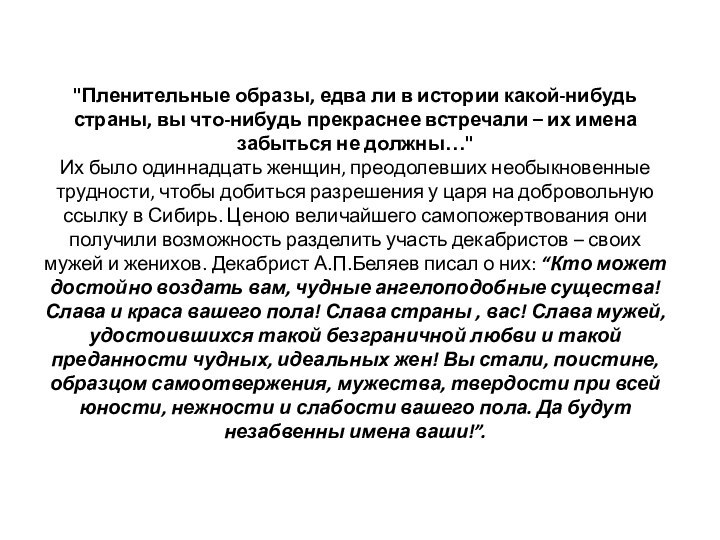 должны…" Их было одиннадцать женщин, преодолевших необыкновенные трудности, чтобы добиться разрешения у царя на добровольную ссылку в Сибирь. Ценою величайшего самопожертвования они получили возможность разделить участь декабристов – своих мужей и женихов. Декабрист А.П.Беляев писал о них: “Кто может достойно воздать вам, чудные ангелоподобные существа! Слава и краса вашего пола! Слава страны , вас! Слава мужей, удостоившихся такой безграничной любви и такой преданности чудных, идеальных жен! Вы стали, поистине, образцом самоотвержения, мужества, твердости при всей юности, нежности и слабости вашего пола. Да будут незабвенны имена ваши!”.
