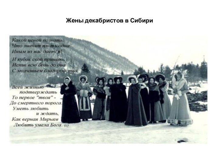 187 лет отделяют нас от сурового студеного дня, когда лучшие сыны России В истории каждой страны есть незабываемые памятные даты. Проходят годы, меняются поколения, В их числе три генерала (Волконский, Фонвизин, Юшневский), восемь полковников (С.П.Трубецкой, А. С.Волконский М.А.Фонвизин ЮШ͘ЕВСКИЙ Алексей Петрович (1786-1844), декабрист, генерал-интендант 2-й армии. Член «Союза благоденствия», один ТРУБЕЦКОЙ Сергей Петрович (1790-1860), князь, декабрист, полковник. Участник Отечественной войны 1812 и МУРАВЬЕВ Никита Михайлович (1795-1843), декабрист, капитан. Брат А. М. Муравьева. Участник заграничных В.Л.Давыдов Среди 121 осужденного декабриста к 14 декабря 1825 года женатыми были лишь 27 июля 1826 года в сопровождении секретаря графа Лаваля швейцарца Карла В конце декабря 1826 года из дома Волконских в Петербурге выехала к С 1827 года начали доставлять осужденных в Читу. Первой здесь обосновалась Александра Елена Нарышкина Наталья Дмитриевна Фонвизина Анна Розен ЮШ͘ЕВСКАЯ (Куликовская) Мария Каземировна (1790-1863), жена декабриста А. П. Юшневского. В 1830 Александра Ивановна Давыдова Камила ЛЕ- Дантю в качестве невесты приехала к Ивашову Молодой, блестяще Среди жен декабристов оказалась в Чите и юная француженка Полина Гебль, 4 года провели декабристы в Читинском остроге. В августе 1830 года их Встреча Полины Гебль и Юрия Анненкова в руднике (эпизод из кинофильма «Звезда пленительного счастья») Венчание Полины Гебль с Юрием Анненковым в Читинской церкви. (Эпизод из кинофильма «Звезда пленительного счастья») Наступил 1856 год. Год смерти Николая I. В связи с коронацией нового Дом Трубецких в Иркутске Полина ГебльДо СибириПосле Сибири Юрий Анненков До восстания декабристовПосле ссылки С.П.Трубецкой С.П.Трубецкой до восстания декабристовС.П.Трубецкой после амнистии Памятник Ивашовым в ТуринскеПамяти Камилы      Есть одна Жены декабристов в Сибири К теме «Восстание декабристов» обращались многие писатели и поэты X1X века. Среди
