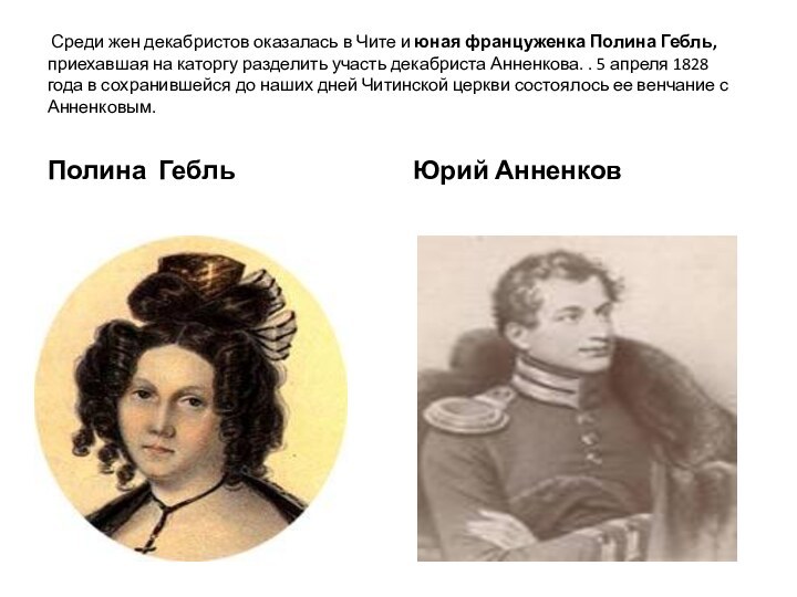 декабриста Анненкова. . 5 апреля 1828 года в сохранившейся до наших дней Читинской церкви состоялось ее венчание с Анненковым.