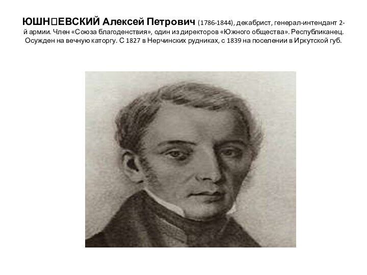 Слайд 7 ЮШ͘ЕВСКИЙ Алексей Петрович (1786-1844), декабрист, генерал-интендант 2-й армии.