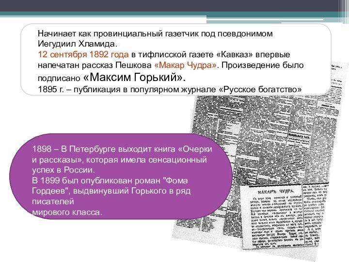 В 1901 — 1902 г.г. написал свои первые пьесы «Мещане» и