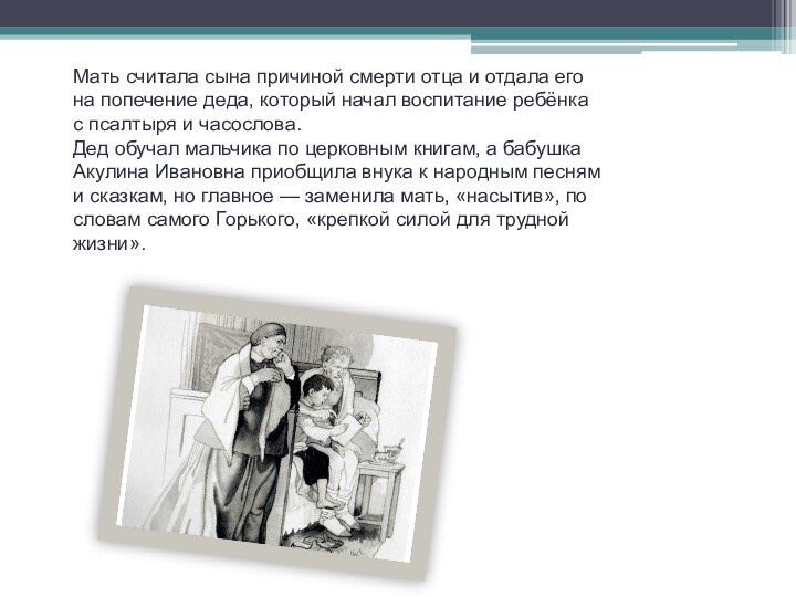 Дед обучал мальчика по церковным книгам, а бабушка Акулина Ивановна приобщила внука к народным песням и сказкам, но главное — заменила мать, «насытив», по словам самого Горького, «крепкой силой для трудной жизни».