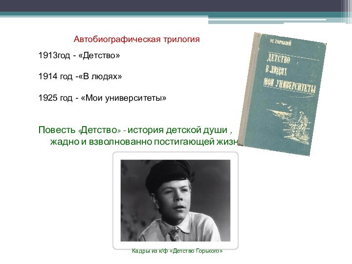 1913год - «Детство»1914 год -«В людях»1925 год - «Мои университеты»Повесть «Детство»