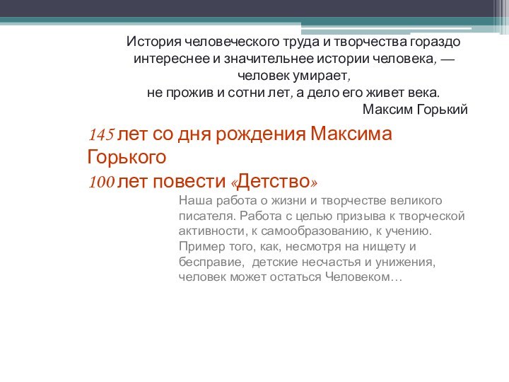 145 лет со дня рождения Максима Горького100 лет повести «Детство»Наша работа о жизни и творчестве великого писателя. Работа c целью призыва к творческой активности, к самообразованию, к учению.Пример того, как, несмотря на нищету и бесправие, детские
