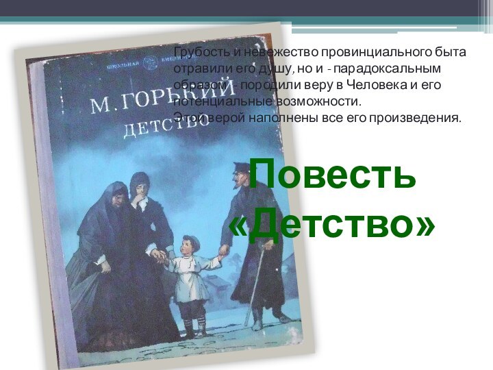 Максим Горький Работу выполнила: Шестакова Наталья ученица 11 классаРаботу проверил: учитель Мельникова С.В. 145 лет со дня рождения Максима Горького100 лет повести «Детство»Наша работа о Настоящее имя – Алексей Пешков. Родился 16 марта 1868 в Нижнем Новгородев Мать считала сына причиной смерти отца и отдала его на попечение деда, Творческий путь«Я уверен, что писателем человека делает детство, способность в раннем возрасте В 1901 — 1902 г.г. написал свои первые пьесы «Мещане» и «На 1934 год – Максим Горький выступает в качестве организатора и председателя I Грубость и невежество провинциального быта отравили его душу, но и - парадоксальным 1913год - «Детство»1914 год -«В людях»1925 год - «Мои университеты»Повесть «Детство» - Тяжелые картины детства«Дом деда был наполнен горячим туманом взаимной вражды всех со Тяжелые картины детства«Каширины, брат, хорошего не любят, они ему завидуют, а принять Тяжелые картины детства«Я запомнил: мать – не сильная, она, как все, боится Спасибо всем за внимание!!!