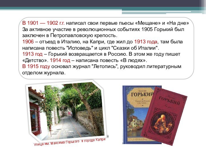1906 – отъезд в Италию, на Капри, где жил до 1913 года, там была написана повесть "Исповедь" и цикл "Сказки об Италии".