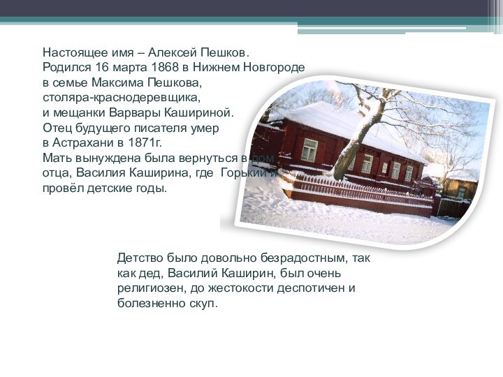 Настоящее имя – Алексей Пешков. Родился 16 марта 1868 в Нижнем