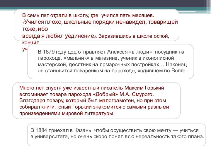 1913 год – Горький возвращается в Россию. В этом же году пишет «Детство». 1914 год – написана повесть «В людях».