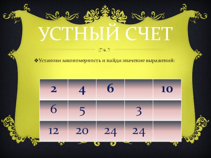 УСТНЫЙ СЧЕТУстанови закономерность и найди значение выражений: