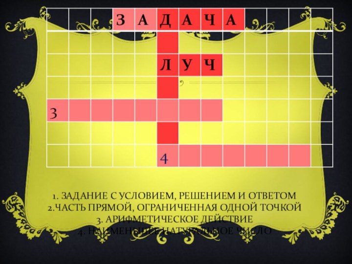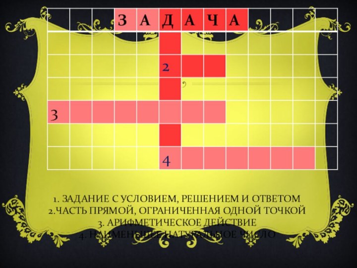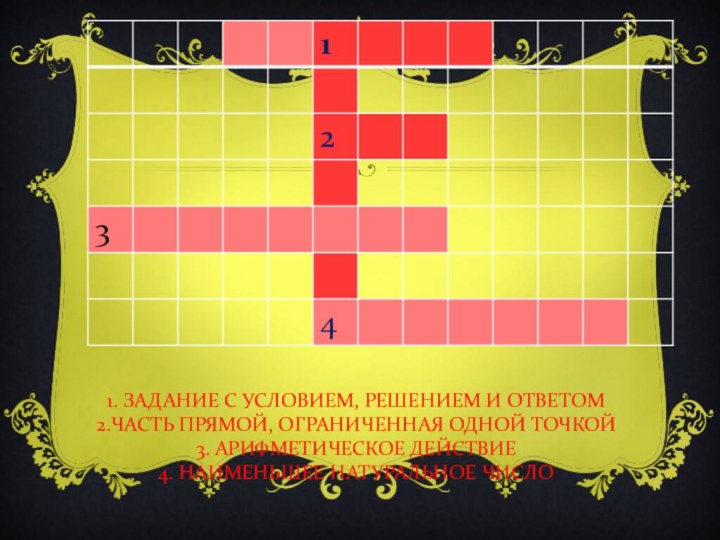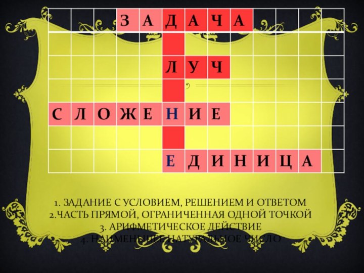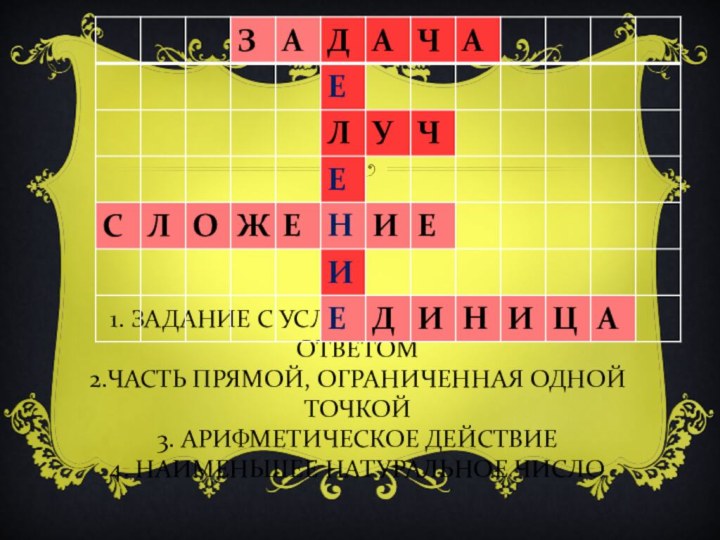 ОГРАНИЧЕННАЯ ОДНОЙ ТОЧКОЙ 3. АРИФМЕТИЧЕСКОЕ ДЕЙСТВИЕ 4. НАИМЕНЬШЕЕ НАТУРАЛЬНОЕ ЧИСЛО